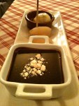 Dietro la porta a battente unico con ritorno automatico si apre la camera delle meraviglie, una cucina acciaio inox che, per quanto mi sia stato dato di sbirciare, pareva brillare anche in pieno servizio, il regno indiscusso dello Chef Stefano Zonca, valdostano d’adozione, ha preso i natali in Gattico, terra di Piemonte così grassa e sapiente da bastare al resto del mondo. Uomo di cucina esperto con esperienze in tristellati quali La Tante Claire, London o l’enoteca Pinchiorri, Florence; mica chiacchiere, ristoranti che in cucina non hanno cuochi ma brigate organizzate come un esercito della delizia, capace di atterrarti solo con lo stordimento della papilla gustativa… E questo, Chef Zonca, lo ha imparato bene.Primo fra tutti, nei suoi piatti, è il Gusto ( non crediate sia cosa scontata ), mai eccessivo, sempre delicato con punte acidule e fresche, si compone come una pittura antica assemblando i vari componenti, scomposti, che formano la pietanza. Noi ci siamo concessi: carciofo ripieno, crema di sedano rapa, misticanze invernali; fonduta di Fontina d’alpeggio, miele al tartufo bianco, toast di pain brioche; zucca marinata, anatra affumicata, praline di fegatini alle nocciole, pane grigliato; tortelli di ricotta e cime di rapa, ragù di capra; spaghetti alla chitarra di farina di castagne, verza scottata, bagna caoda; sottofiletto di vitella farcito al lardo in crosta di flakes di castagne, purea di cavolfiore, bietoline; mela tatin, crema al mascarpone, hot shot mela grappa rosmarino; zuppetta di cioccolato, pera e gelato alla vaniglia, briciole di meringa… E come digestivo un affascinate distillato di Sambuco. Ultima chicca, da non sottovalutare, era buono pure il caffé.
