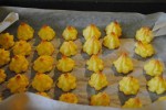 Aspettando il termine della cottura non so come impiegare il tempo: metto a bollire mezzo Kg di patate rosse di Torgnon, dopo di che le passo stile puré, aggiungo 80 gr di burro, due rossi d’uovo, sale e noce moscata. Il composto nel sac à poche, beccuccio a stella: teglia da forno, carta da forno, forno duecento gradi, quindici minuti. Pomme duchesse. E buon appetito