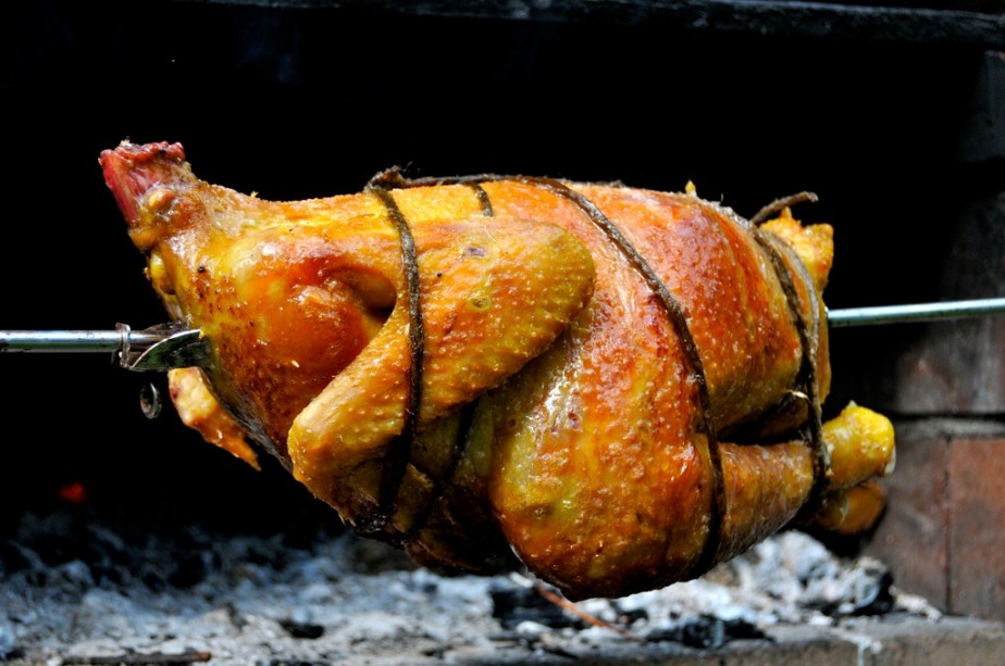 Senz’ombra di dubbio alcuno, la più antica forma di cucina utilizzata dall’uomo: del fuoco e della carne. La semplicità assoluta, quella apprezzata dai re di tutte le epoche, il pollo arrosto, che sulla tavola di Luis XVI veniva servito à la volée ovvero fatto a pezzi da un cameriere esperto che lasciava cadere nel piatto, dall’alto, il pezzo del pollo richiesto dal commensale. La stessa tavola che veniva imbandita da cuochi esperti che, dopo varie decapitazioni e la conseguente perdita dell’impiego a corte, subirono una fortunata diaspora culinaria che li portò ad impossessarsi delle sudice locande plebee per farne dei Restaurant indirizzati alla nuova, ricca e intelligente borghesia gourmet, inventando così il concetto di cucina moderna. Nella cottura arrosto la fanno da padrona: il tempo, gli odori dell’orto, i grassi nobili della bestia elevata a pasto e, fuori di dubbio, la materia prima, nel caso specifico il pollo: ruspante, nutrito a cereali e di quasi quattro chili. Dalle otto alle tredici, una cassa di legno di ciliegio, un girarrosto ( elettrico per carità, siamo contro la schiavitù ) ed il risultato è visibile sopra queste poche righe. Abbinato al polletto un Refosco dal peduncolo rosso, colli orientali del Friuli, ben strutturato con la giusta barrique. Una sola parola resta da dire: acquolina.
