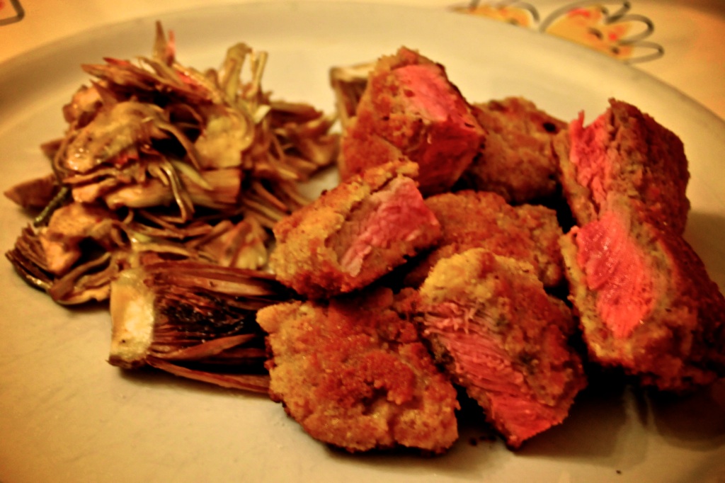 Dopo sessantotto ore trascorse a trangugiare acqua e tisane ( follia depurativa ), questa leccornia ci voleva proprio. Filetto di fassona in doppia panatura: si passano le fette nella farina, poi nell’uovo, in seguito in un miscuglio di grissini triturati e camomilla sbriciolata; si lasciano riposare le bistecche dieci minuti in frigo quindi si ripassano nell’uovo, precedentemente salato, e di seguito nel pan grattato. Far sciogliere abbondante burro chiarificato, in una padella antiaderente, e far rosolare le bistecche cinque, sei minuti per parte. Il risultato è una panatura croccantissima e un interno cotto al punto giusto, rosato. Ho accompagnato il tutto con una insalatina di carciofi condita con vinegrette all’aceto balsamico e un radicchio rosso tardivo di Treviso fatto appassire in padella senza condimenti.