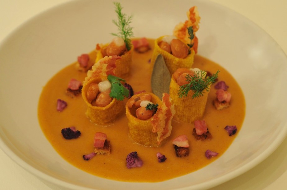 Un piatto invernale, un’eccellenza contadina che ho voluto rivisitare per far si che prendesse un po’ di brio. Il risultato lo vedete sopra: paccheri stracotti in brodo di zafferano e finocchietto, soffiati in olio bollente; crema di fagioli borlotti rinvenuti in soffritto profumato al timo; crostini al sentore d’aglio fanno da letto a cubetti di guanciale essiccato al forno. I fagioli mantenuti interi danno la consistenza, la pancetta asciugata del suo grasso, la croccantezza, i cavolfiori viola sbollentati in acqua e aceto, l’acidità. A coronare il tutto una fonduta magra e fredda di parmigiano reggiano colata direttamente nel pacchero. Da provare.