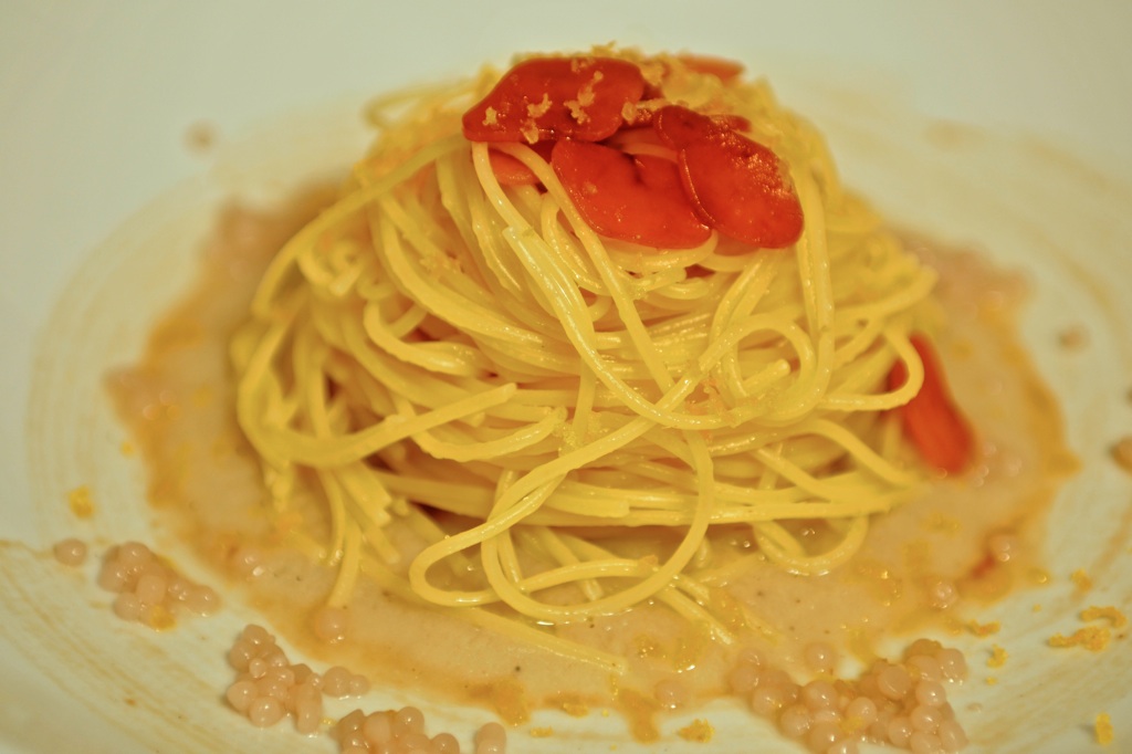 Un nuovo esperimento, riuscito. Mischiare ingredienti di mare e di montagna è prassi ormai consolidata nella cucina occidentale. Lo spaghetto scolato al dente viene fatto rinvenire in padella con olio e bottarga di muggine resa croccante dalla cottura. Nel piatto stendo col pennello un gel di porcini ricavato dalla bollitura in acqua di 60 gr di porcini secchi, tolti dal liquido, che ho poi addensato con un mezzo cucchiaino di fecola di patate. Sopra il profumo di porcini ho adagiato la crema di topinambur e finocchio, ricavata dalla bollitura dei due ingredienti su un soffritto di cipolla, e sopra di questa un nido di spaghetti. Bottarga croccante e una grattugiata di bottarga fresca. Tutt’intorno ho adagiato del caviale di acciughe ottenuto facendo sciogliere 25 gr. di acciughe, asciugate bene dall’olio, in 120 gr. di acqua; ho frullato il tutto e passato il liquido attraverso un setaccio fine. Ho poi inglobato al liquido stesso 1 gr. di algina. Ho sciolto in 130 gr. di acqua fredda 4 gr. di cloruro di calcio e nel liquido ottenuto ho fatto colare, goccia a goccia, il composto di acciughe ottenendo così delle piccole sfere simili al caviale. ( La sferificazione funziona e apre nuove ed infinite strade creative! )