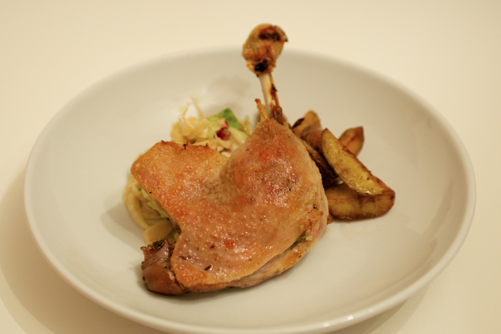 Il segreto della cucina confit sta nella doppia cottura della carne: la prima a freddo effettuata dal sale durante la marinatura con cipolle, aglio, prezzemolo, rosmarino e dragoncello; la seconda, che potremmo chiamare cottura a media temperatura, avviene in forno a circa 85 gradi, in un bagno di grasso d’oca. Il risultato è una carne tenerissima ma compatta che sprigiona i gusti, succhiati durante la marinatura di una notte, ad ogni morso.
