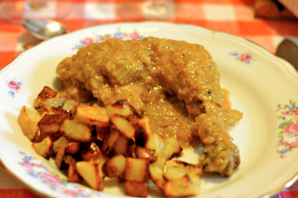 Piattoforte del pranzo di compleanno del saggio capofamiglia, la faraona così cucinata è ricetta contadina tanto antica quanto semplice. Smembrare l’uccello ed affogarlo un giorno e una notte in vino bianco ( non vi fidate mai di chi vi dice che per cucinare va bbbene pure el vin en cartun, non è vero: pietanza prelibata vuole buon vino, da bere con lei e da bere lei ) io ho usato dell’ottimo Est Est Est, vino di cui consiglio di ricercare la storia. La marinatura va eseguita congiuntamente a carote, sedano, cipolla bianca, alloro, timo, rosmarino, chiodi di garofano e bacche di ginepro. A faraona completamente ubriaca toglietela dal vino, infarinatela e fatela incroccantire da tutti i lati in quella prelibata delizia che nasce dalla panna bovina e prende il nome di burro, io ho usato il demi-sel d’Isigny. Dopo di che trasferite il vino, le verdure ed i gusti nella pentola e fate cuocere il tutto ad andamento lento per una quarantina di minuti ( il tempo è ahimè calcolato su un uccello che mai ruspò ). Cotto il tutto spostate la carne in una ciotola e con la forchetta schiacciate le verdure fino a creare una crema che, assaggiandola, vi farà complimentare con voi stessi. Aggiustate, se necessario, di sale e pepe il sugo ed incorporatevi nuovamente il volatile. Servite caldo vicino a due patatine forno e timo. Dimenticavo, se l’avete, decapitate un Guado al Tasso, sarà il giusto compagno di avventura.