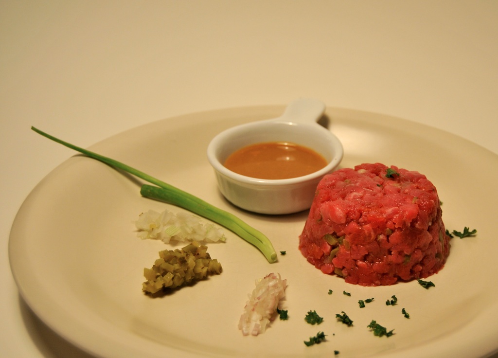 Può sembrare ovvio, la tartare fatta col filetto è un’altra cosa. Così non è. I bovini sono costituiti da innumerevoli parti e alcune di queste si prestano ad esser mangiate triturate, crude ( ricordo ancora piacevolissimamente un centrale di bue battuto a coltello, il pranzo di Natale di qualche anno addietro ). No, un’altra cosa è battere la carne a coltello. Questo procedimento, lungo quanto fantastico nel risultato, è immensamente migliore dell’utilizzo del tritacarne. Elimina fondamentalmente, quella spiacevole sensazione di ovattamento tattile del palato. Io la mia tartare la condisco con: scalogno, cipollotto, cetriolini sott’aceto, prezzemolo, il tutto finamente tritato; un filo d’olio evo e sale grezzo della Camargue.