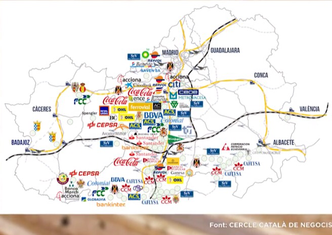 È chiaro credo a tutti che la questione dell’indipendentismo catalano non si limiti ad un capriccio di un popolo parlante una lingua propria, detentore di una gustosissima cucina propria e ricchissimo di usi e costumi secolari; beninteso le ragioni più profonde sono radicate nel tessuto sociale ma soprattutto economico della società civile ed imprenditoriale catalana. La battaglia, oggi come in passato, si combatte sui numeri quindi questi numeri vanno conosciuti. Partiamo da alcune considerazioni: lo stato spagnolo si è a lungo rifiutato di fornire informazioni sui bilanci regionali, nel 2008 alcuni dati sono venuti alla luce e si è così confermato che il deficit accumulato dallo stato catalano dal 1986 ammontava a più di duecento miliardi di euro. Bisogna sapere che in Spagna, unico stato dell’unione europea, esiste un ” fondo di solidarietà ” istituito virtualmente per aiutare le aree depresse della nazione; la Catalogna ha contribuito a questo fondo con circa l’8% del suo PIL annuo. La crisi del 2008 sommata a questa continua emorragia di tasse che escono e non rientrano hanno condizionato notevolmente e al ribasso l’economia dell’intera regione. Come se non bastasse entra in gioco anche il FLA ( Fondo di Liquidità dell’Autonomia ), in questo fondo dovrebbero essere reindirizzate le tasse spettanti ai governi autonomi di Spagna per la gestione dell’autonomia appunto ( in Catalogna sono autonome la scuola, la sanità ecc. ) ma qualcosa di strano avviene nei passaggi di bilancio dallo stato centrale alle autonomie periferiche, i soldi non arrivano tutti, le autonomie si vedono quindi costrette a chiedere del denaro in prestito per far funzionare la macchina sociale e i prestiti vengono erogati dallo stesso stato centrale che però ora guadagna degli interessi su detti prestiti. Credo che inizi ad essere più chiara la situazione ma vorrei comunque portare qualche altro esempio: partiamo dalla questione delle autostrade, si pagano 17,40 euro per fare i circa cento chilometri che dividono Tarragona da Alcanar, un tratto di autostrada che ad oggi è stato ammortizzato circa centosessanta volte ma che aumenta costantemente di prezzo perché la concessione alla società statale che lo gestisce è stata rinnovata ab æternum. Gli introiti di queste autostrade, eccessivamente care in territorio catalano, vanno a finanziare opere tanto mastodontiche quanto inutili come la AP41, l’autostrada Madrid-Toledo, arteria praticamente inutilizzata alla stregua della nostra BreBeMi, e che nei piani di Madrid dovrà essere continuata fino a Cordoba, passando per Ciudad Real. La costruzione di queste infrastrutture assolutamente sovradimensionate non ha nulla a che vedere con il miliardo e ottocento milioni di euro di espropri che si sono intascati i proprietari delle fincas a sud di Madrid, caso strano di proprietà dei più alti esponenti di oligarchia, industria e azienda pubblica di Spagna che hanno visto aumentare il valore dei loro terreni da 28€ al metro quadro a volte fino a 3161€ al metro quadro! ( La cartina pubblicata in alto da un’idea delle aziende proprietarie di quei territori. )